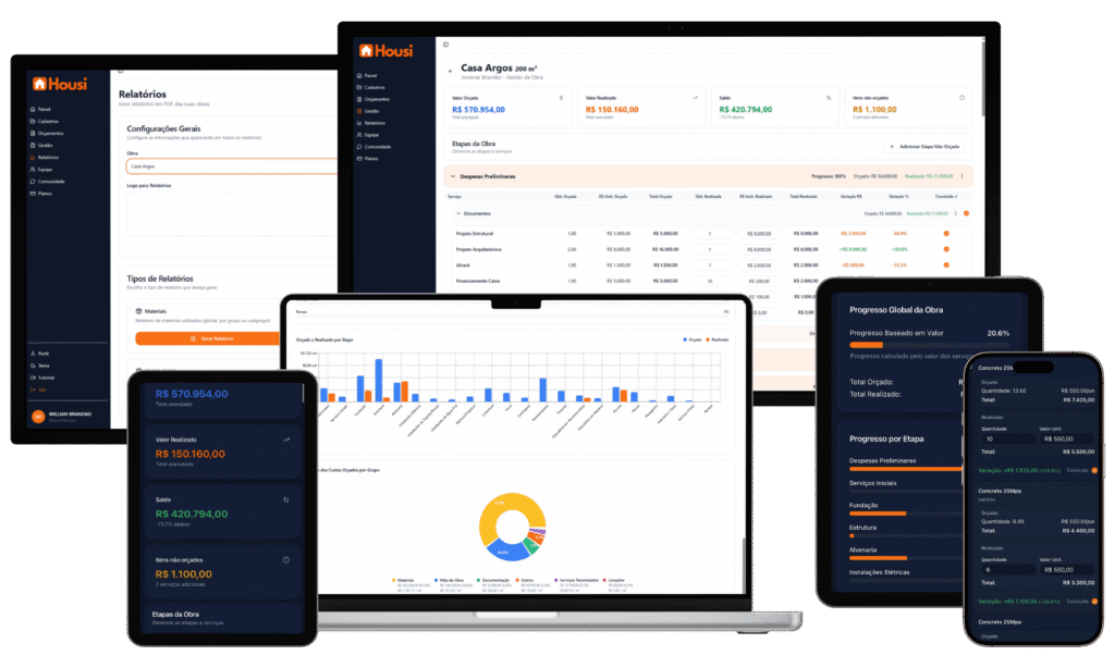Sim. A HOUSI centraliza orçamento, estoque, financeiro, lançamentos, gestão da obra e relatórios. Você não precisa mais usar planilhas separadas, o sistema faz todos os cálculos automaticamente e evita erros comuns de controle manual.