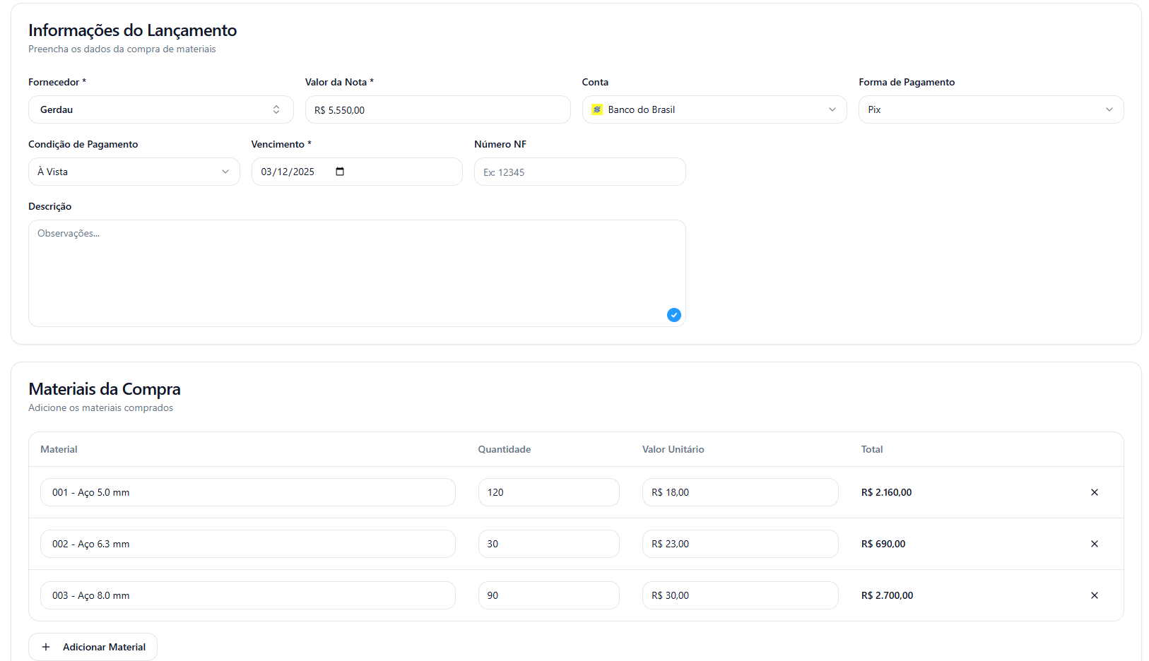 Na aba de Lançamentos você registra compra de materiais, despesas financeiras, valores a receber e transferências bancárias.