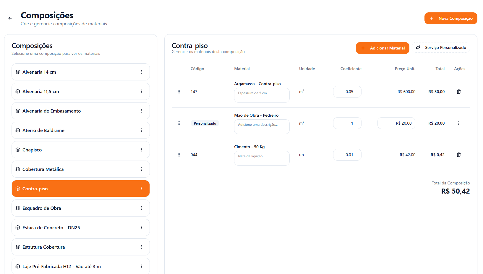 Com base em toda a estrutura de cadastros de insumos e composições do sistema, você consegue construir orçamentos precisos em até 10x menos tempo que utilizando planilhas ou métodos convencionais.