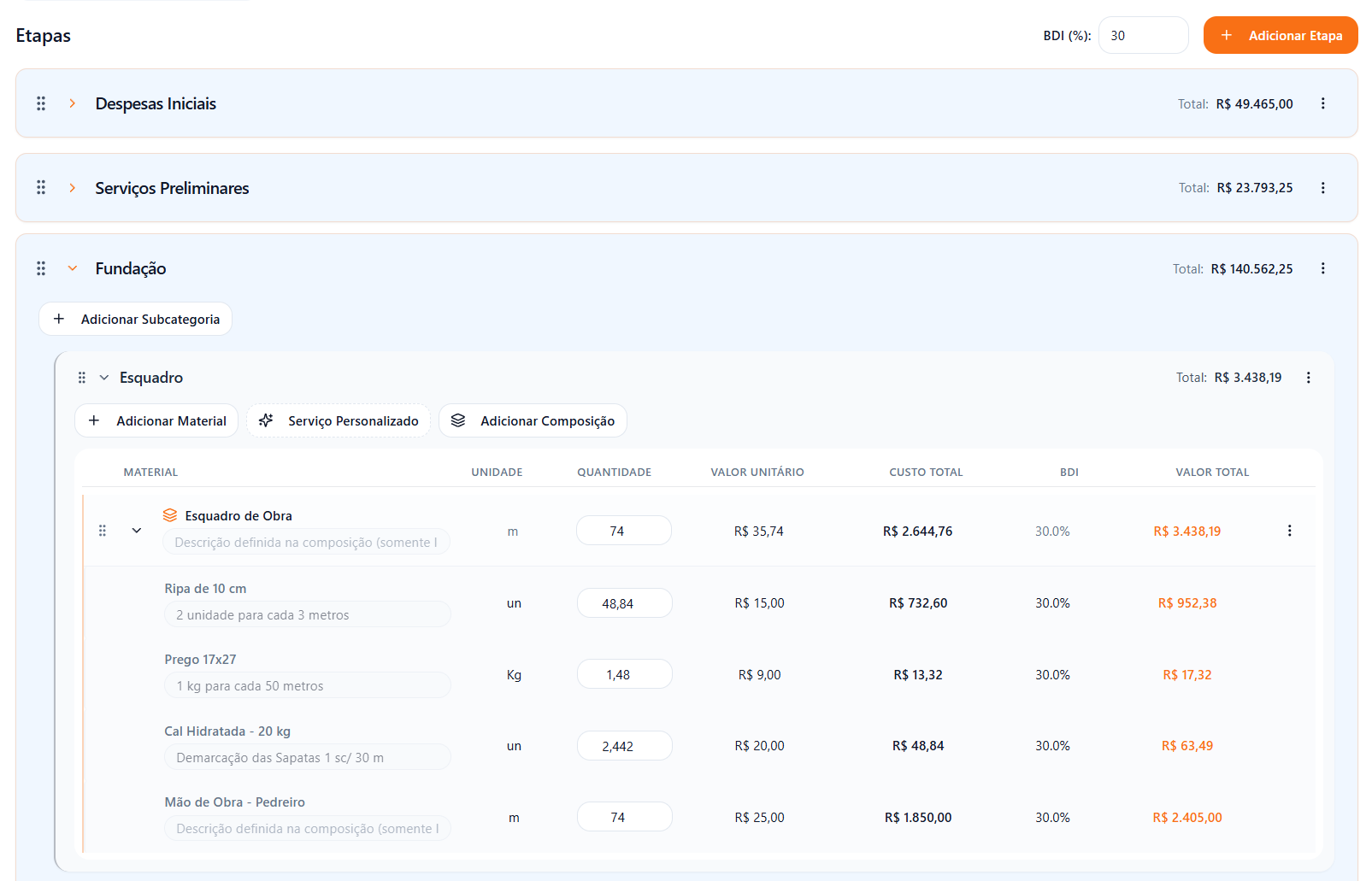 A Housi foi estruturada para te entregar praticidade durante toda a fase de orçamento, em minutos você consegue montar uma EAP completa, com todas as etapas de sua obra.
