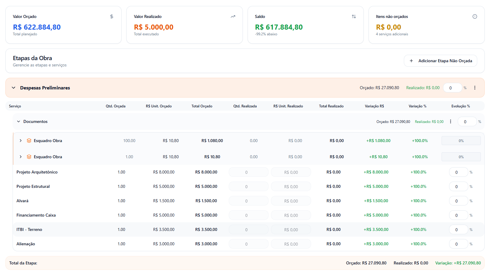 Na aba de gestão você tem um panorama real da sua obra, conseguindo visualizar a evolução de cada etapa, itens que excederam o orçamento, quais grupos tem maior concentração de recursos, serviços que não foram considerados no orçamento, e muito mais…