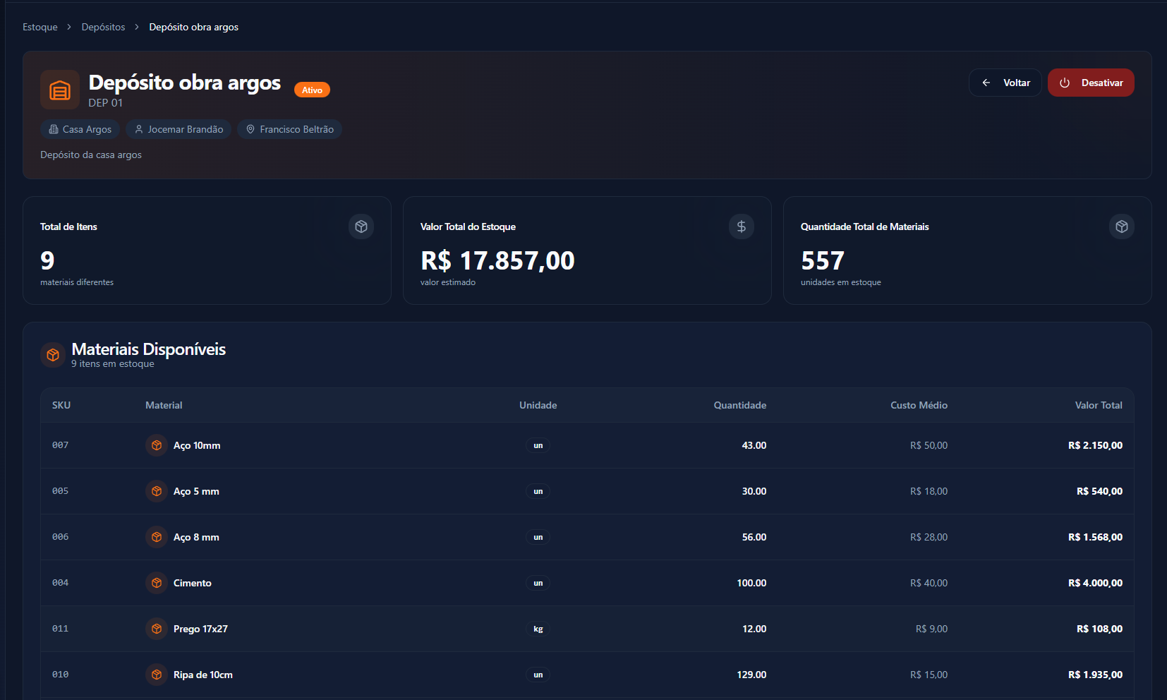 Na aba de estoque você pode gerenciar os insumos de cada uma de suas obras de forma separada e organizada, contando com um fluxo simples, onde você consegue realizar movimentações entre depósitos, ou alocar materiais diretamente na obra com poucos cliques.