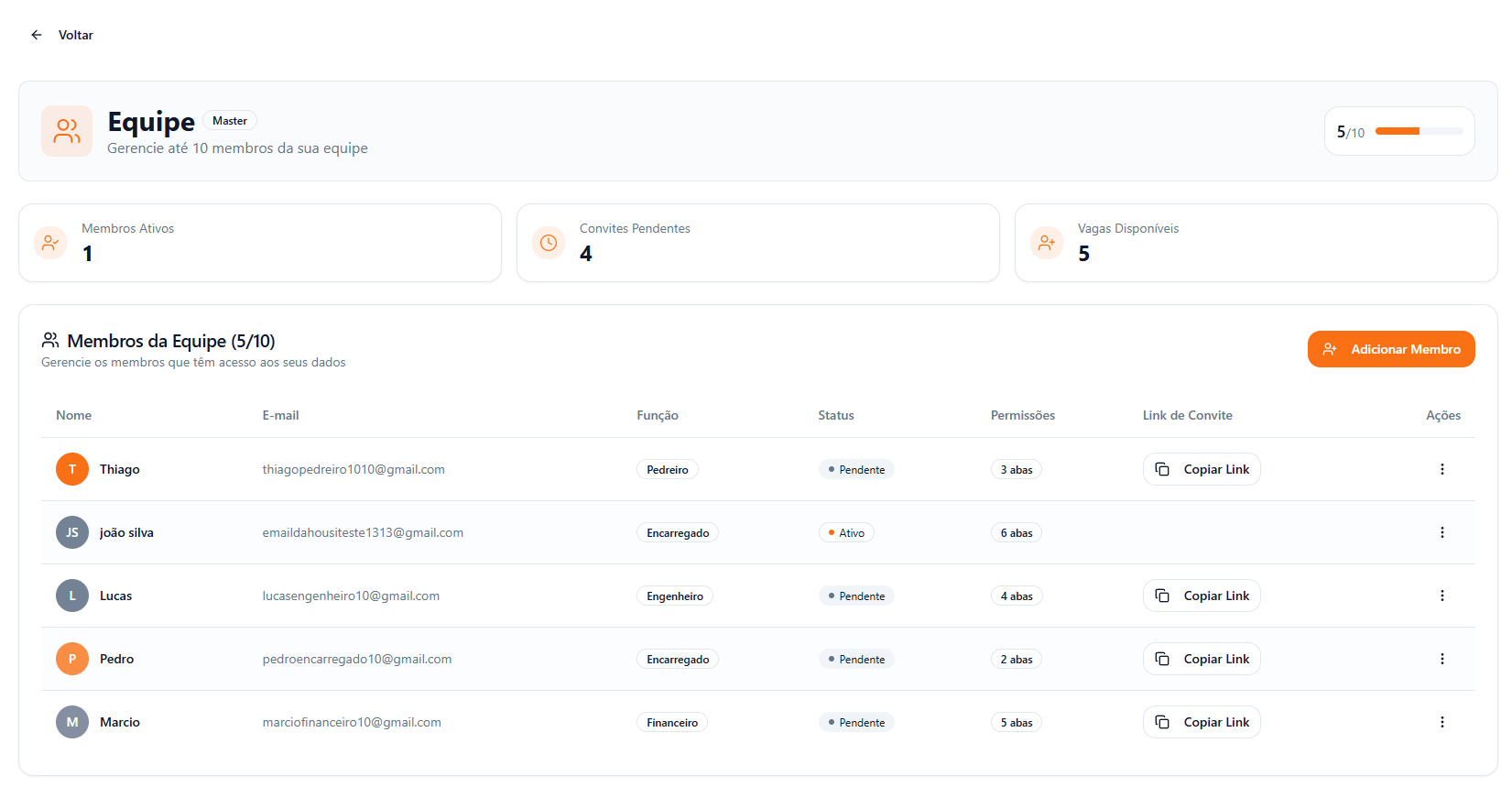 Gerencie usuários, permissões e acessos. Controle quem pode editar orçamentos, lançar materiais, acessar o financeiro ou visualizar relatórios.