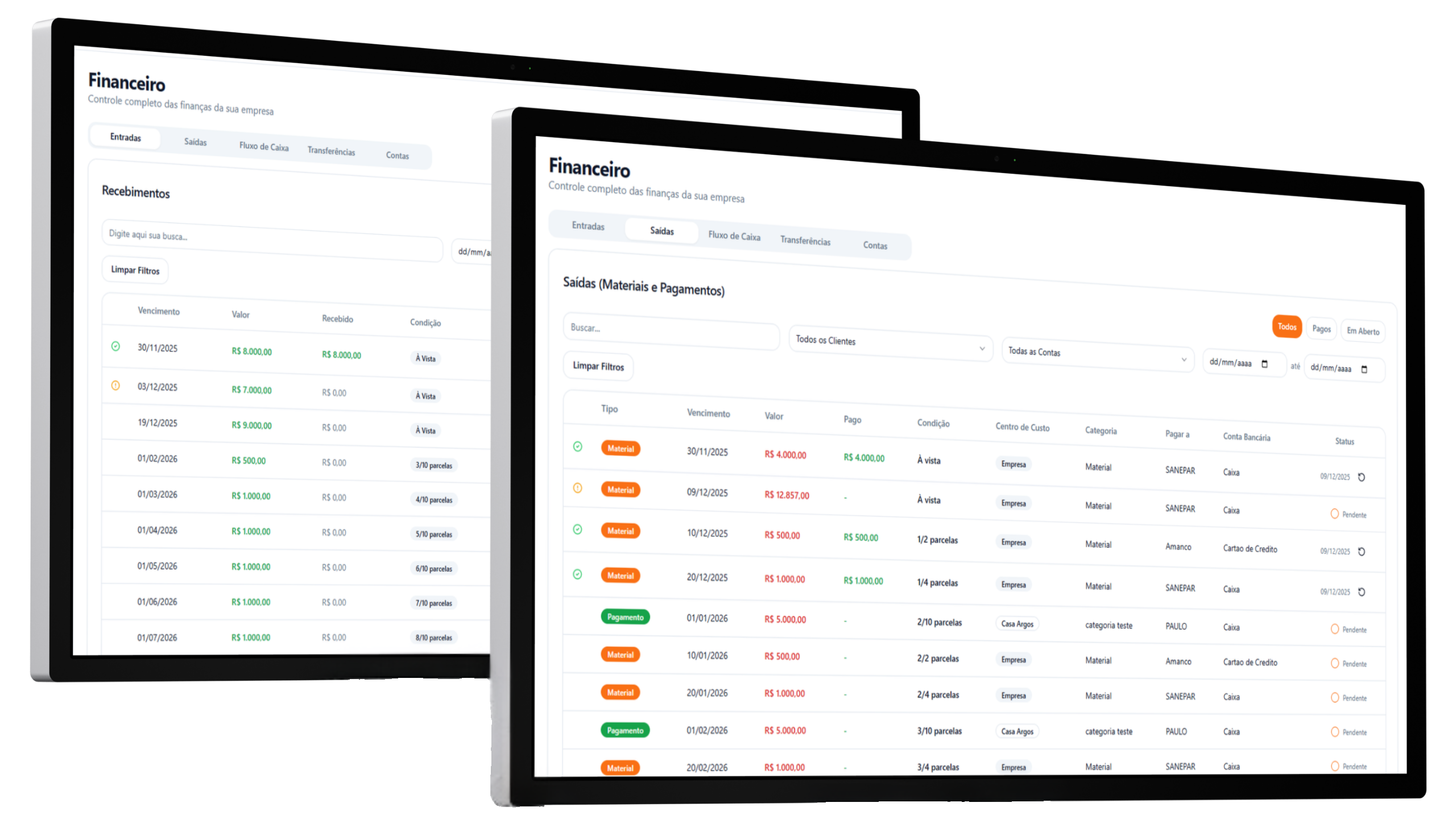 Já em recebimentos você pode registrar todas as entradas financeiras dos seus clientes, seja de uma obra ou projeto, garantindo previsibilidade de receita.