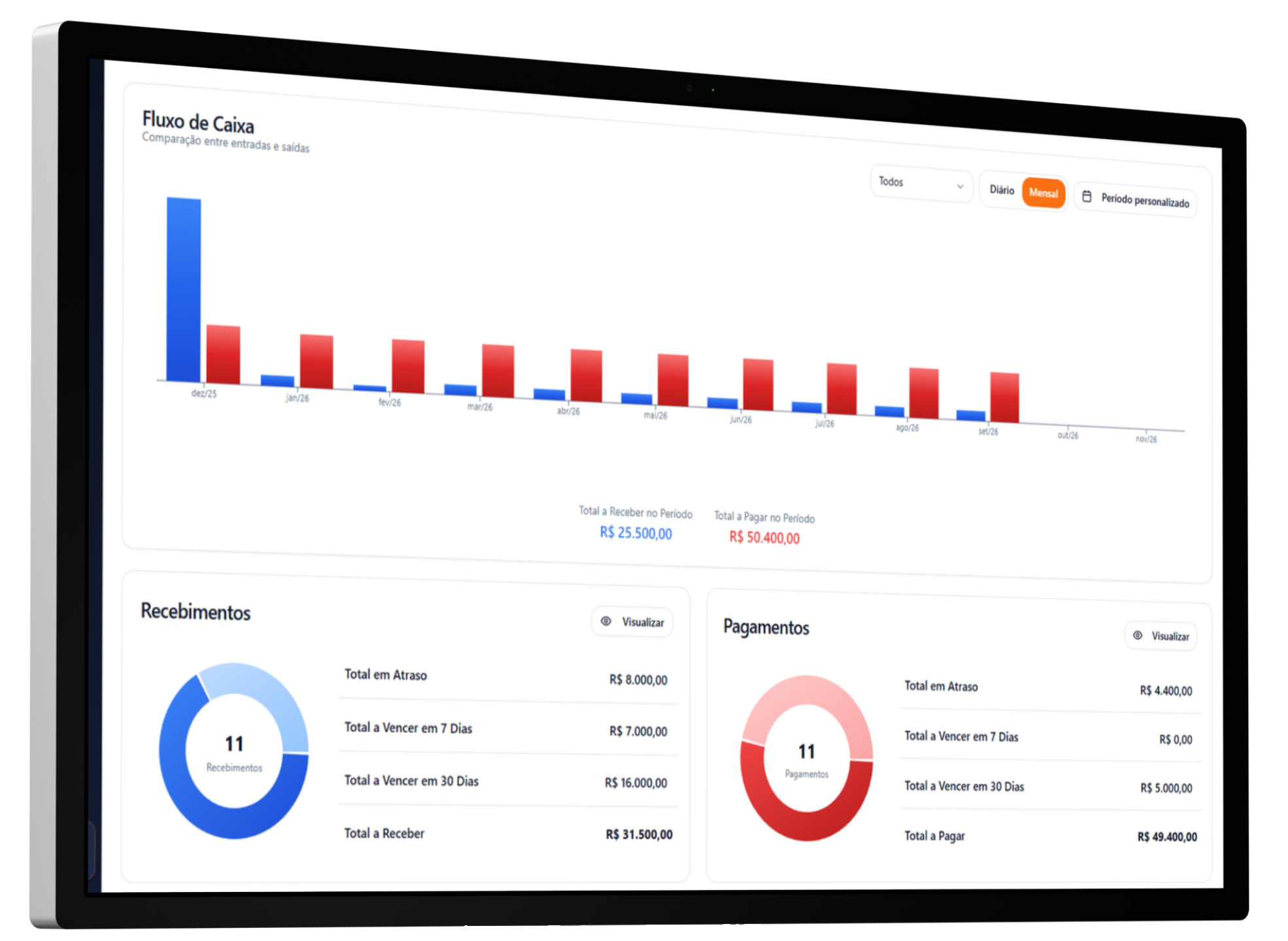 Veja o fluxo de caixa diário e mensal com previsões automáticas. Controle categorias, entradas e saídas financeiras de cada conta bancária e centros de custo. Decisões financeiras seguras e baseadas em dados concretos.
